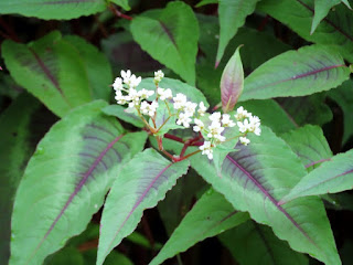 Delicate little flowers above those lovely leaves with deep pink central veins and pink stained areas.